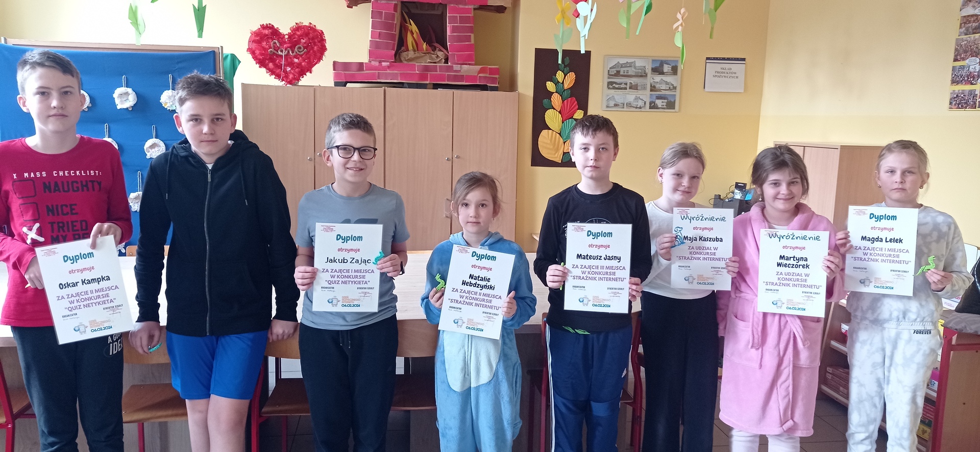 Na przełomie lutego i marca świętowaliśmy w naszej szkole Dni Bezpiecznego Internetu. Wszystkie klasy brały udział w lekcjach online przygotowanych przez stowarzyszenie NASK i -saferinternetday- Tematyka lekcji online związana była m.in. z pozytywną aktywnością w sieci (kl.7), sztuczną inteligencją - jej możliwościami i zagrożeniami (kl.4,5,6) oraz "Netykietą" - zasadami bezpiecznego serfowania w sieci (kl.1,2,3). Kolejna aktywność odbywała się na lekcjach informatyki - klasy starsze tworzyły aplikacje i quizy związane z "Netykietą", natomiast klasy młodsze miały za zadanie te quizy rozwiązywać. Na lekcjach wychowawczych w klasach 4-7 została poruszona tematyka m.in.: hejtu, phishingu, cyberprzemocy. KLasy 1-4 brały udział w konkursie plastycznym "Strażnik Internetu", którego zwycięzcami zostali: