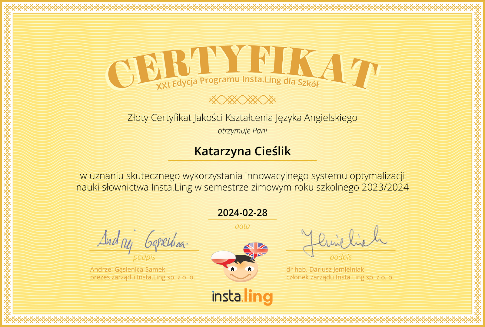 Od września 2023 r. uczniowie klas IV-VII pracują z aplikacją Insta.Ling. Aplikacja słuzy do utrwalania słówek z języka angielskiego. Uczniowie codziennie ( w dni szkolne) ćwiczą słówka podawane im przez system. Dzięki temu utrwlają wiedzę zdobytą na lekcjach języka angielskiego. Dzięki systematycznej i wytrwałej pracy uczniów klas V, VI i VII nasza szkołazdobyła Złoty Certyfikat akości Kształcenia Języka Angielskiego.