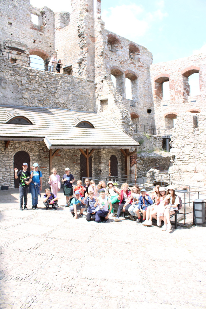 14 czerwca odbyła się wycieczka szkolna dla klasy 3 i 4 do Zamku Ogrodzieniec w Podzamczu, wzniesiony za czasów króla Kazimierza Wielkiego na najwyższym wzniesieniu Jury Krakowsko- Częstochowskiej (515,5 m n.p.m.), to największy i najbardziej znany obiekt zamkowy na Śląsku, a także najpopularniejszy ze wszystkich zamków na Szlaku Orlich Gniazd. Stanowi przykład kunsztu dawnych budowniczych, którzy przez stulecia uczynili z Ogrodzieńca imponującą magnacką rezydencję. W programie wycieczki przewidziane zostały warsztaty rycerskie, zwiedzanie ruin wraz z przewodnikiem. Piękne krajobrazy umilały nam czas podczas pobytu. Uczniowie mieli okazję założyć średniowieczne stroje. Były zabawy, gry ruchowe oraz czas wolny na zakupienie sobie pamiątek.