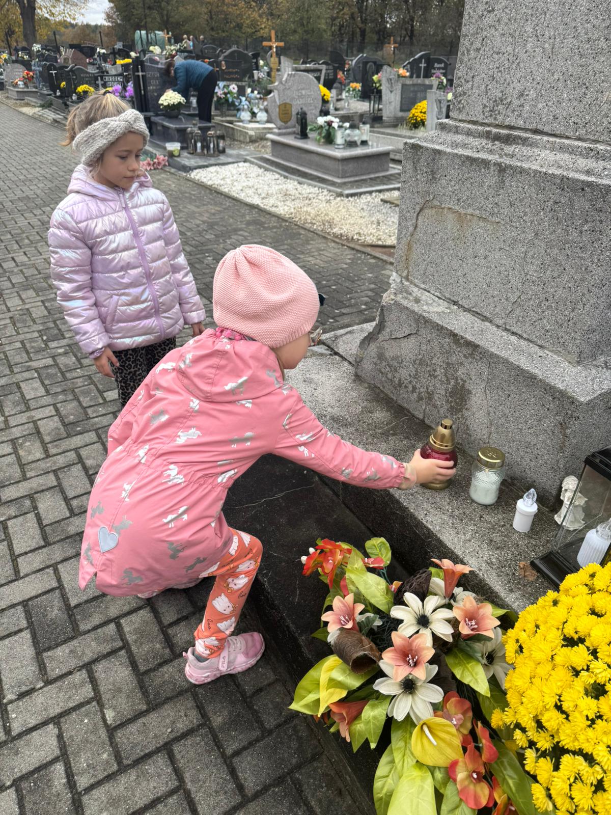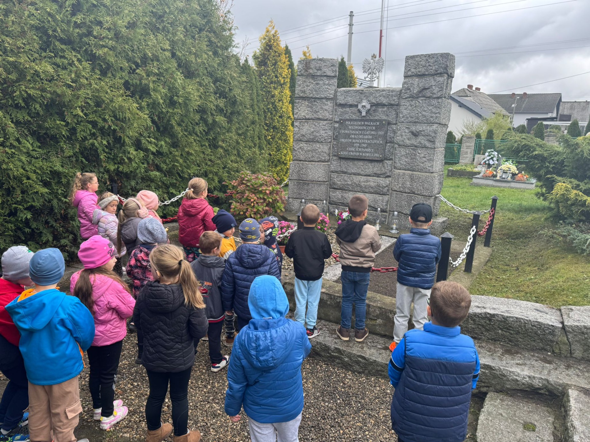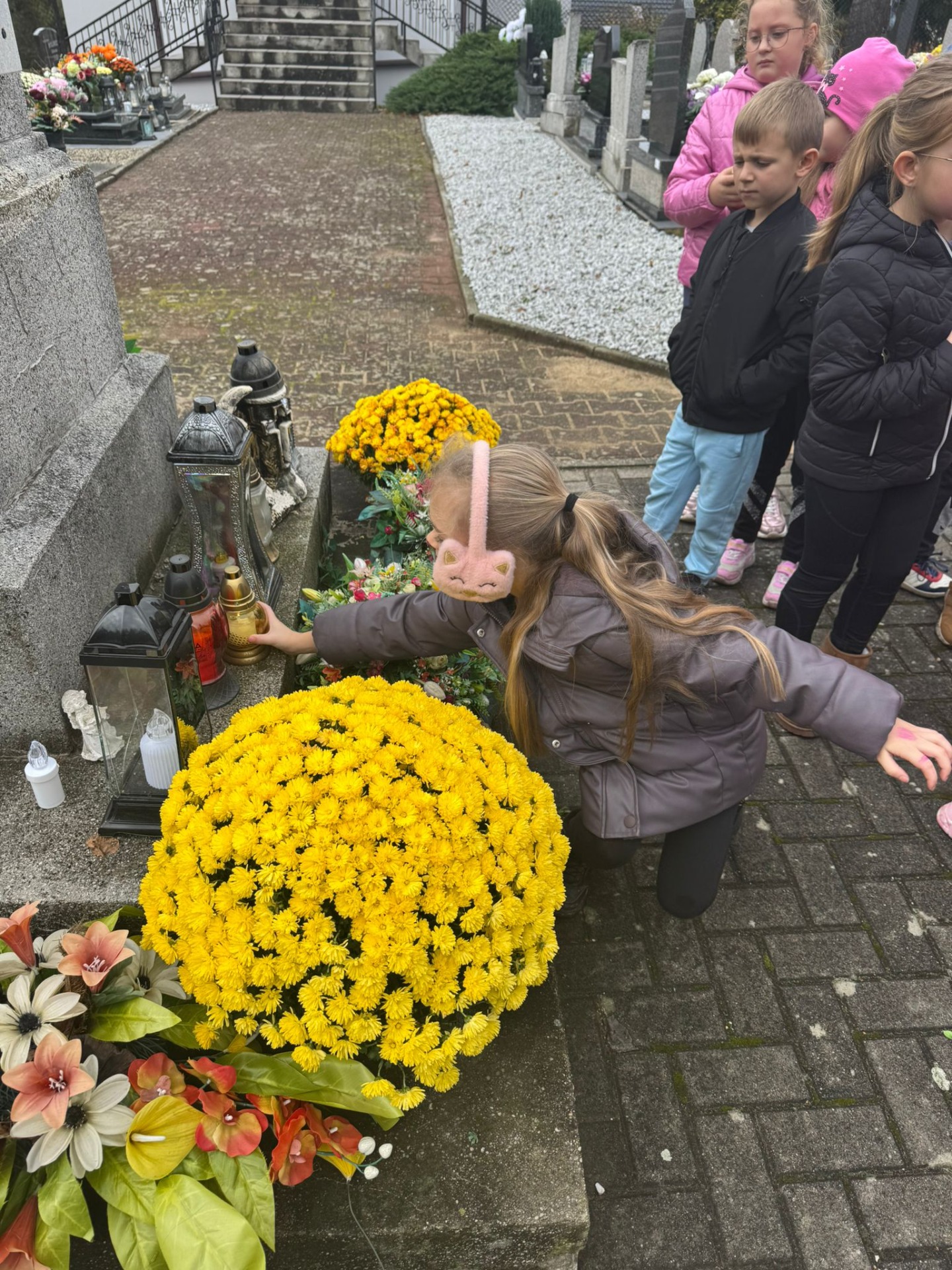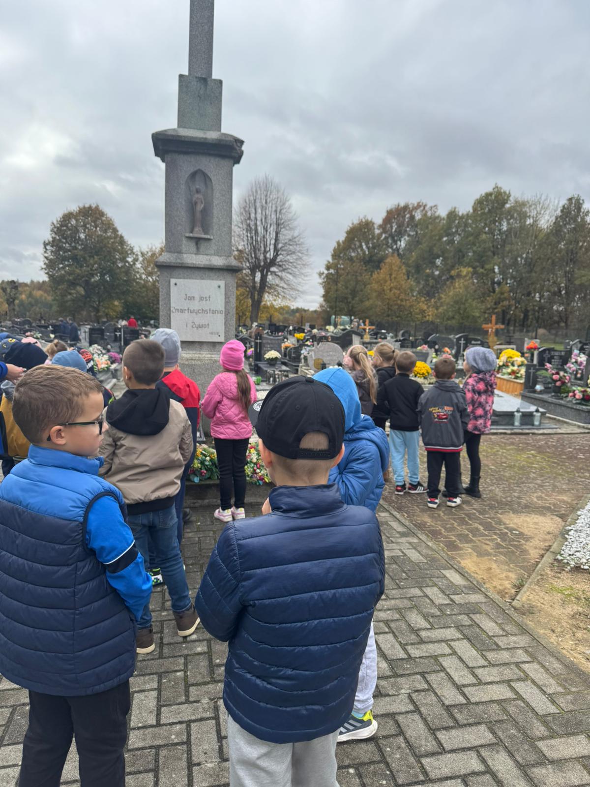 W czwartek 31 października uczniowie klasy pierwszej udali się pobliski cmentarz oraz obejście kościoła celem uczczenia pamięci zmarłych żołnierzy. W czasie wycieczki dzieci poznały tradycje, zwyczaje związane ze świętem zmarłych w naszej kulturze i religii. Zrozumiały też jak należy zachowywać się na cmentarzu, by nie zakłócać spokoju osób odwiedzających to miejsce. To była bardzo ważna lekcja wychowania rodzinnego, obywatelskiego i patriotycznego, która pozostanie dzieciom w pamięci.
