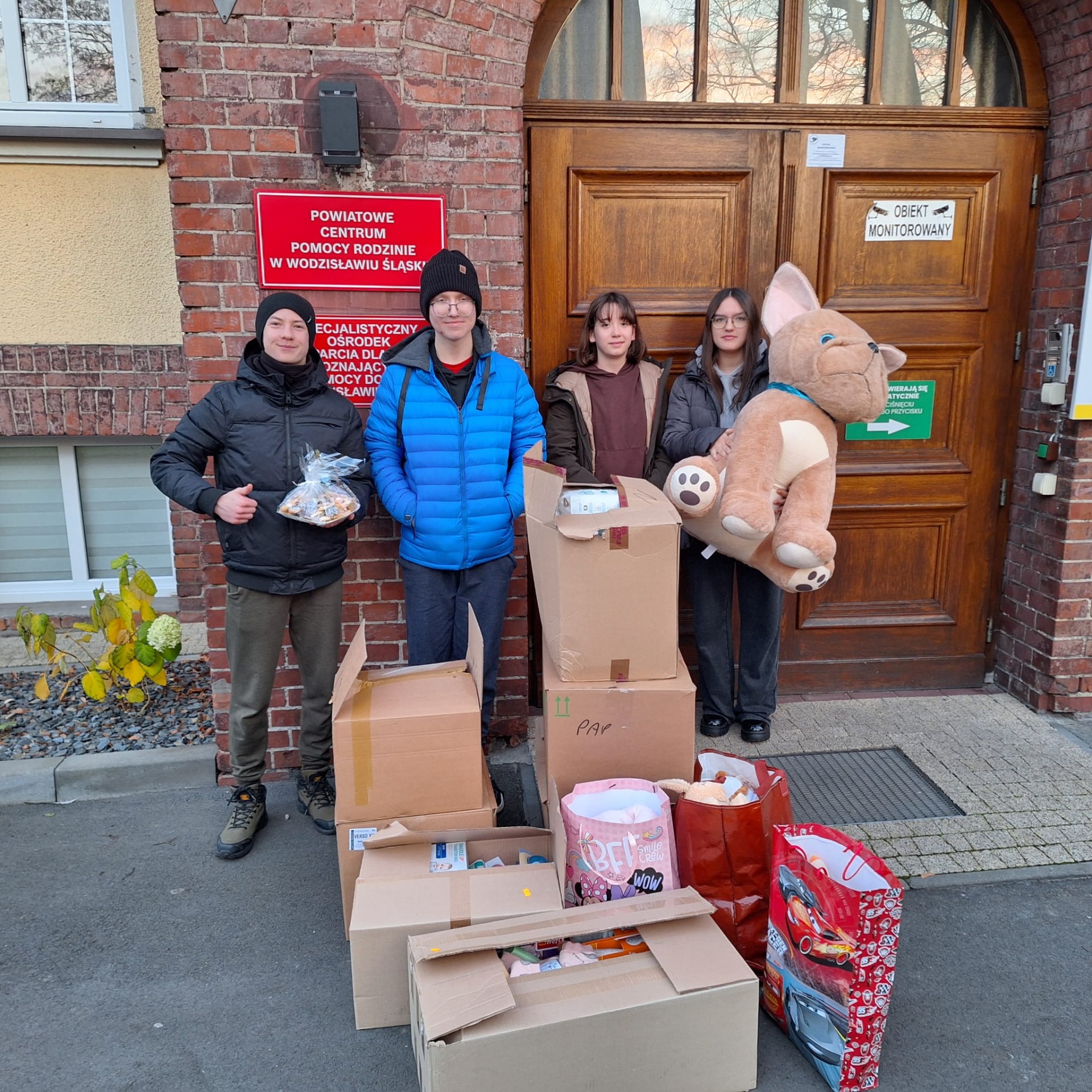 Przez cały listopad w naszej szkole trwała zbiórka na rzecz Specjalistycznego Ośrodka Wsparcia dla Osób Doznających Przemocy Domowej w Wodzisławiu Śląskim. Zbiórkę zorganizowali uczniowie klasy ósmej, którzy w tym roku szkolnym prężnie działają w szkolnym wolontariacie. Dzisiaj delegacja uczniów przekazała zebrane rzeczy do ośrodka. Bardzo dziękujemy wszystkim, którzy dołączyli się do zbiórki.