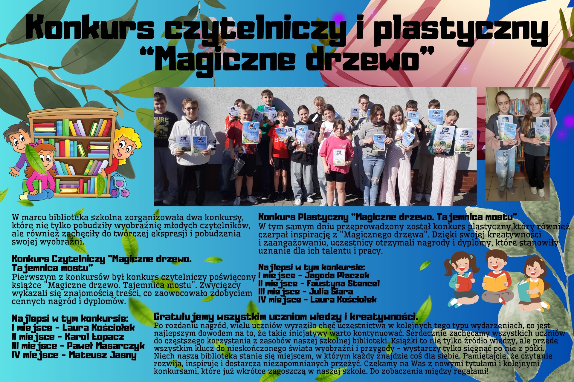 Pierwszym z konkursów był konkurs czytelniczy poświęcony książce "Magiczne drzewo. Tajemnica mostu". Zwycięzcy wykazali się znajomością treści, co zaowocowało zdobyciem cennych nagród i dyplomów.