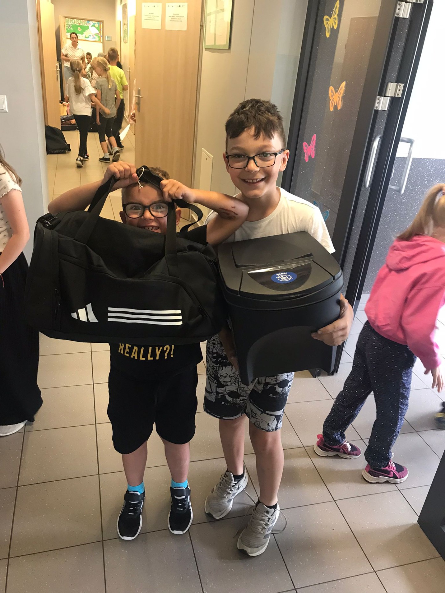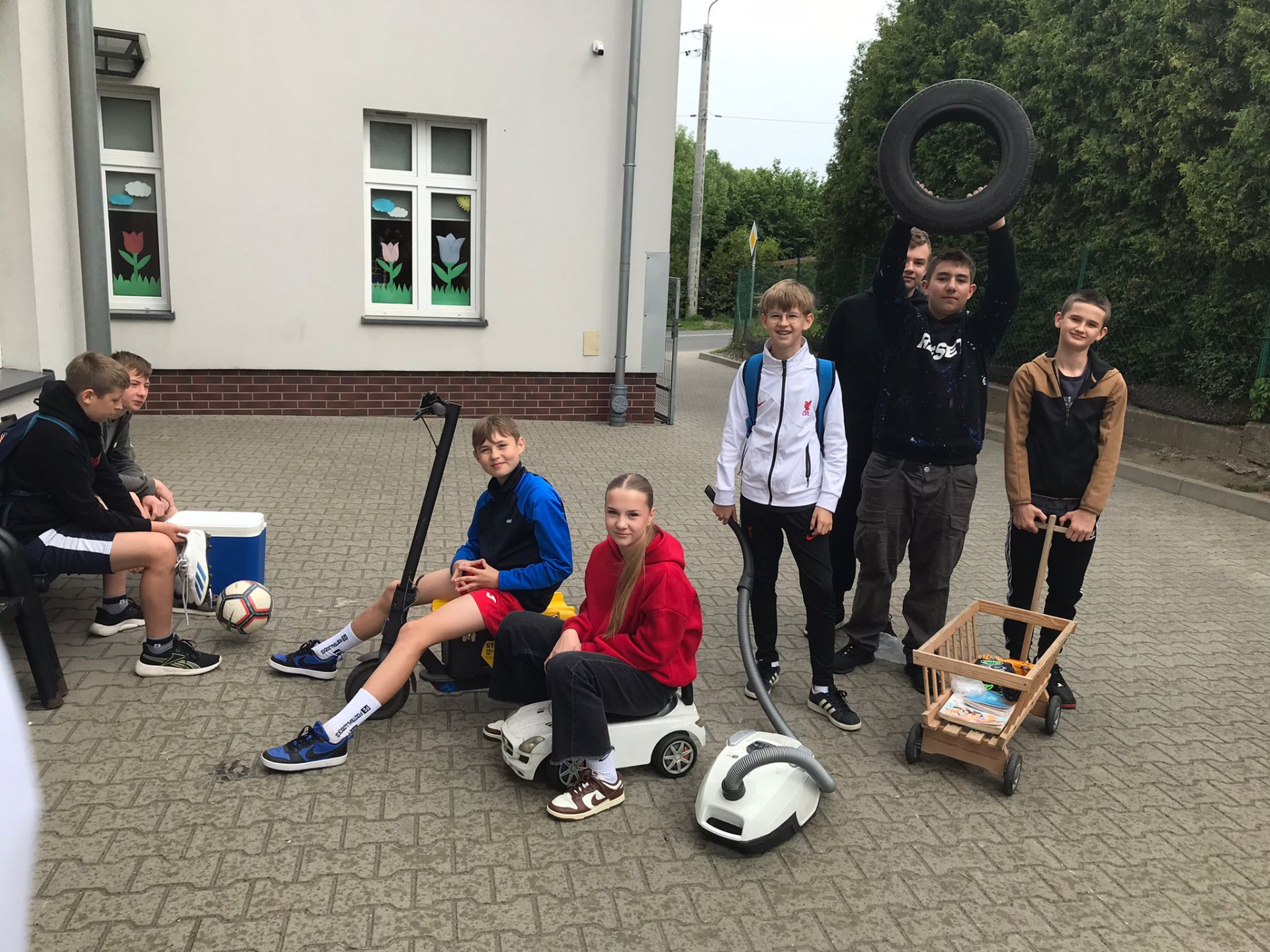 Z okazji Dnia Dziecka Samorząd Uczniowski zorganizował w naszej szkole wyjątkowe wydarzenie – "Dzień bez plecaka"! Tego dnia uczniowie pokazali, że wyobraźnia nie zna granic – książki i przybory szkolne zostały przyniesione w zupełnie nietypowy sposób.