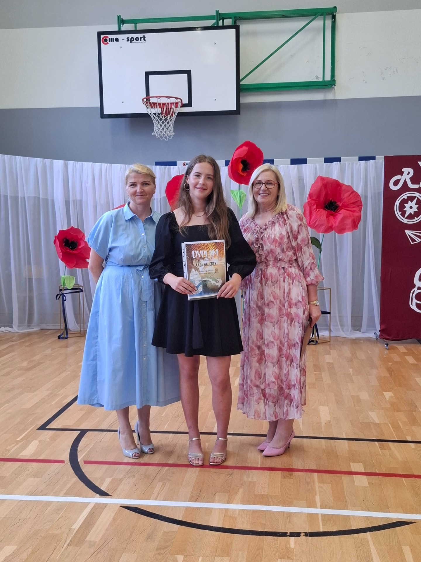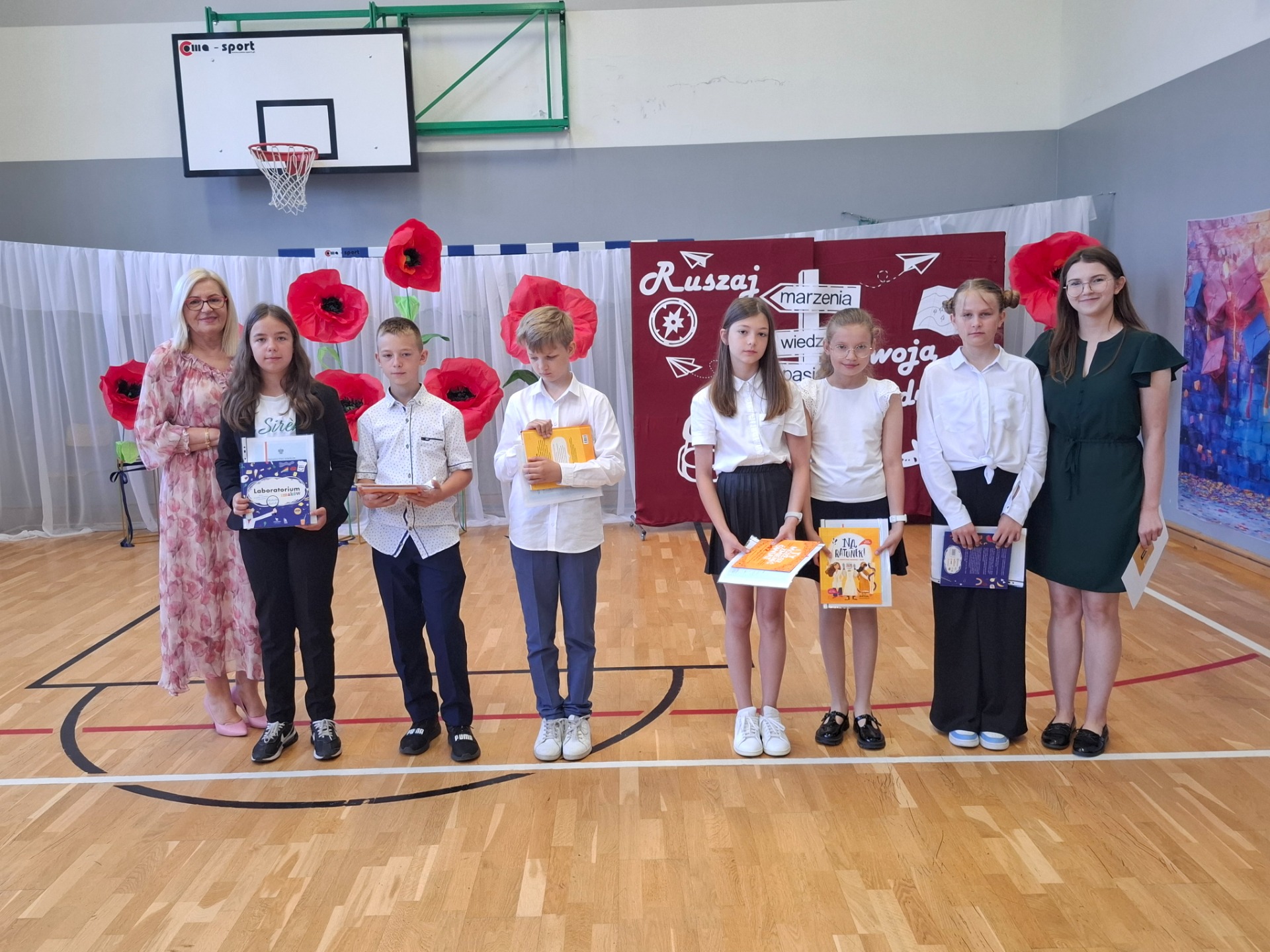 Pani dyrektor dziękowała za ciężką pracę wszystkim uczniom. Duża grupa otrzymała świadectwa z biało- czerwonym paskiem. W tym roku grupa uczniów została uhonorowana dyplomami za godne wyróżnienia zachowanie, kreatywność, reprezentowanie szkoły w konkursach i zdobywanie czołowych lokat.