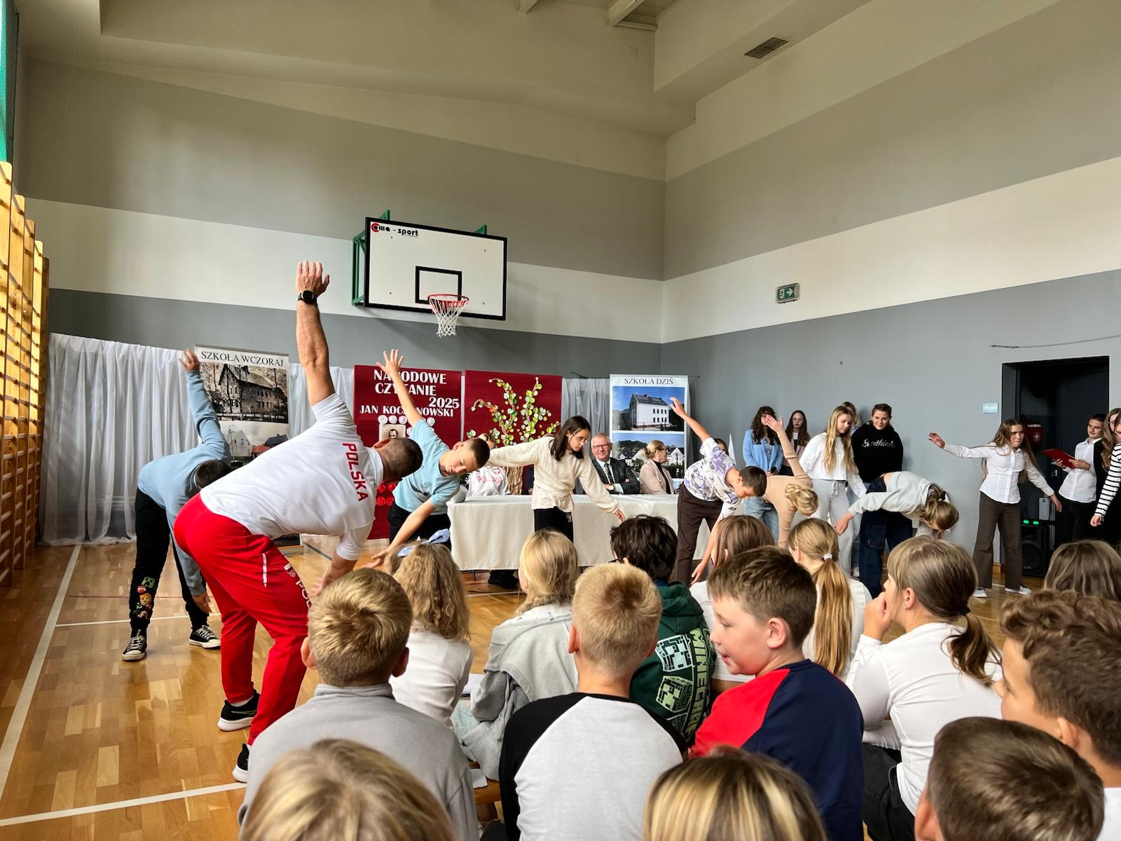 Po części literackiej przeszliśmy do części bardziej aktywnej , w której dwójka naszych gości - pani Justyna i pan Sebastian, zaprezentowali parę ćwiczeń, które wykonywali wylosowani uczniowie danych klas.