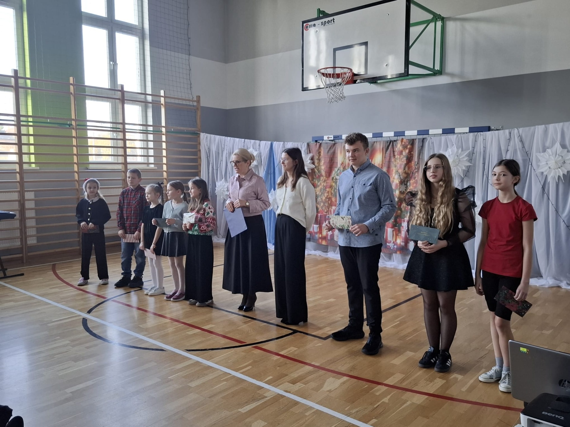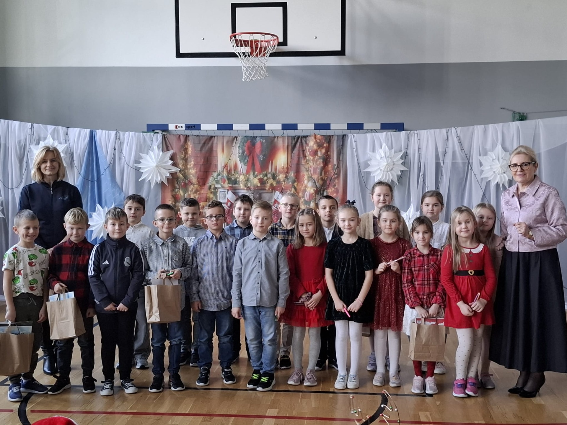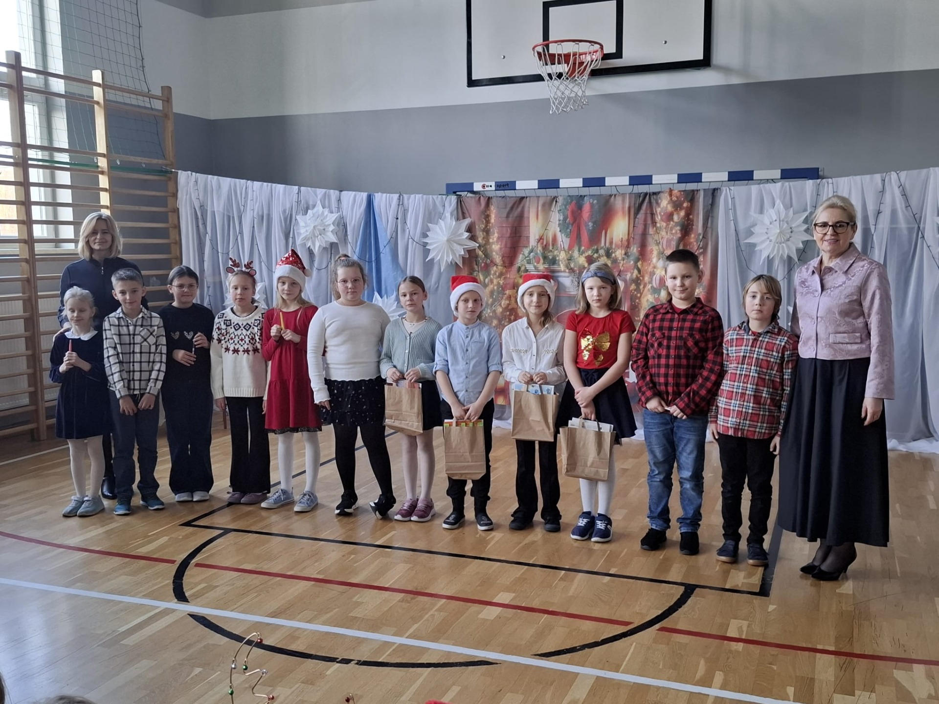 Po kolędowaniu nastąpiło rozstrzygnięcie konkursu na najładniej świątecznie przystrojoną klasę. Przyznano nagrody, a dekoracje zrobiły ogromne wrażenie – było kolorowo, pomysłowo i bardzo bożonarodzeniowo.