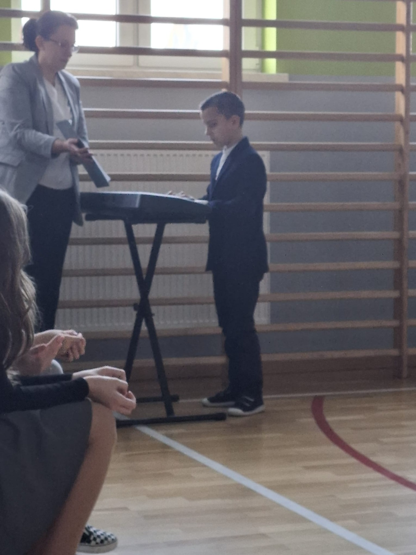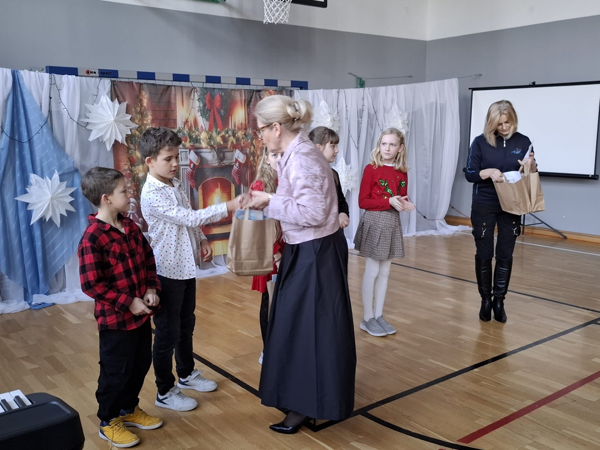 Uczniowie z każdej klasy przygotowali kolędy oraz piosenki świąteczne, które wspólnie odśpiewaliśmy. Niektóre utwory zostały odegrane na pianinie, co dodało całemu wydarzeniu wyjątkowego klimatu. Sala wypełniła się muzyką, uśmiechami i świąteczną energią.