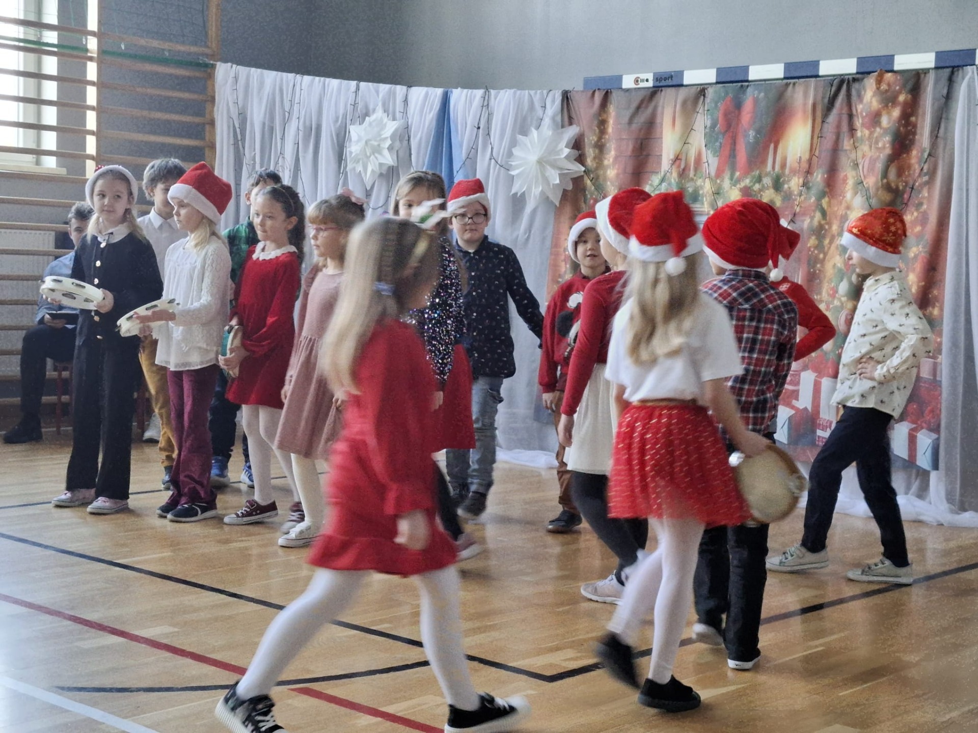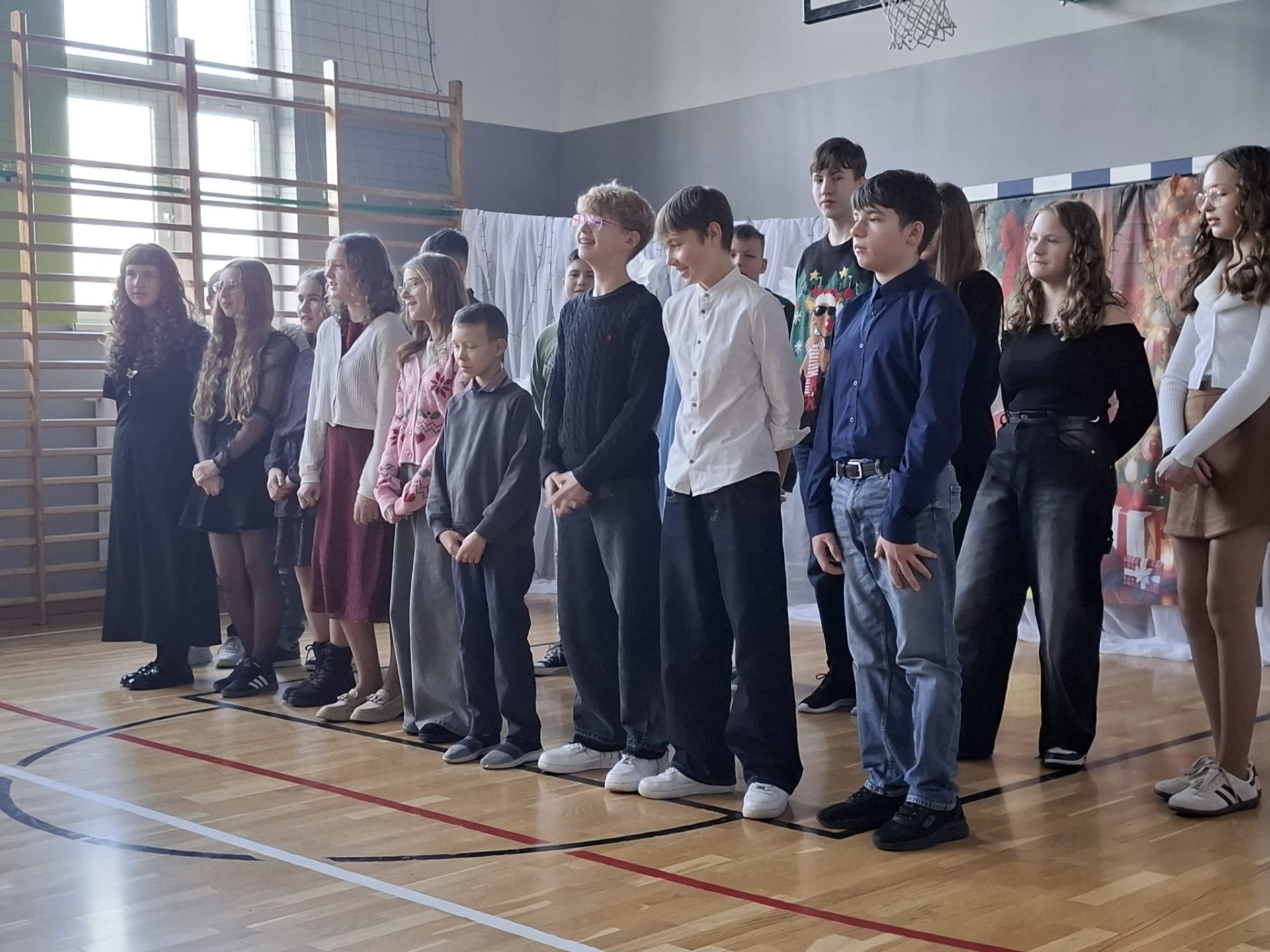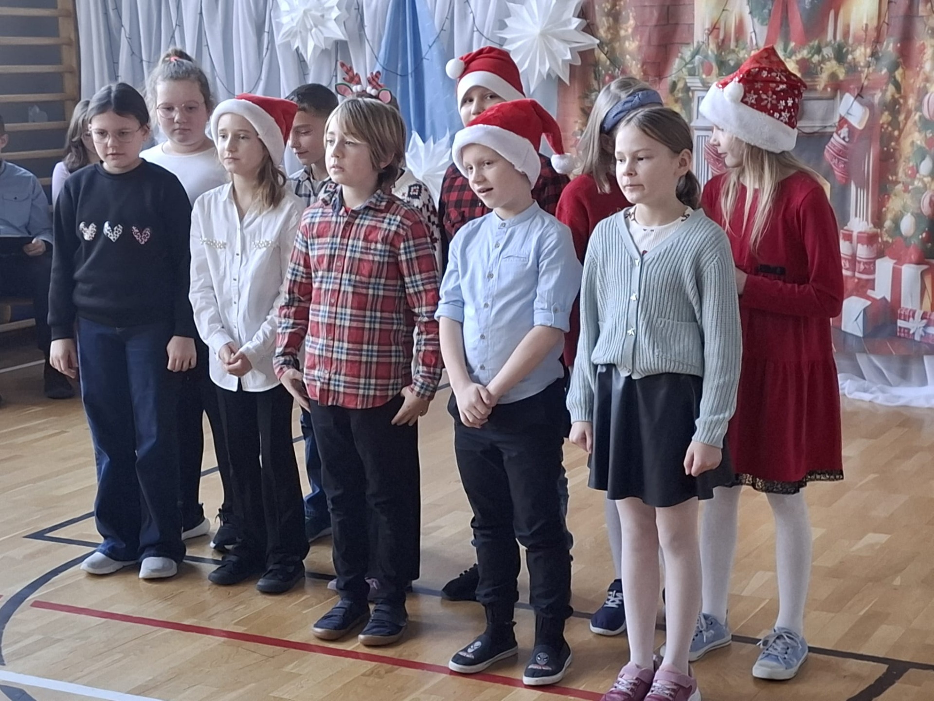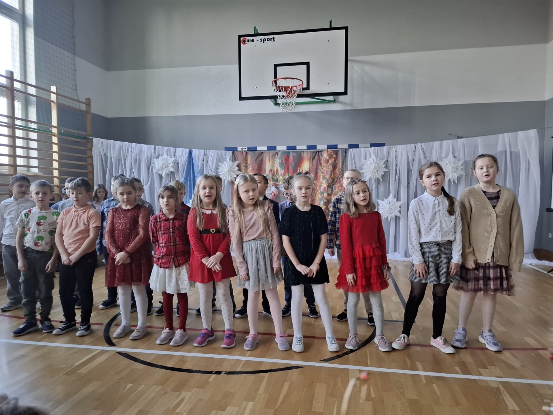 Dziś w naszej szkole zrobiło się naprawdę świątecznie! O godzinie 8:30 wszystkie klasy zebrały się na sali gimnastycznej, gdzie rozpoczęliśmy wspólne kolędowanie. Od samego początku panowała super atmosfera – było radośnie, ciepło i bardzo świątecznie.