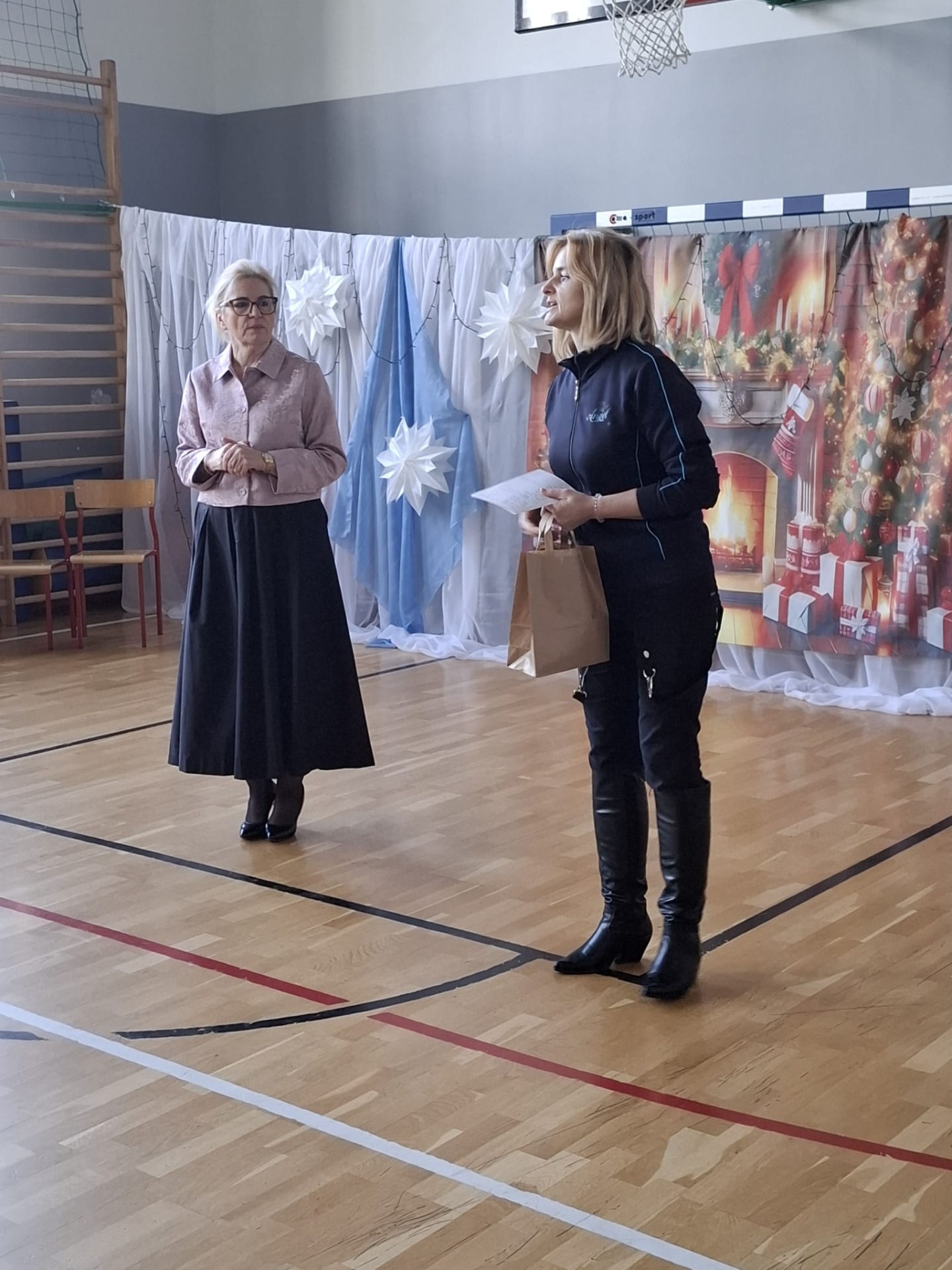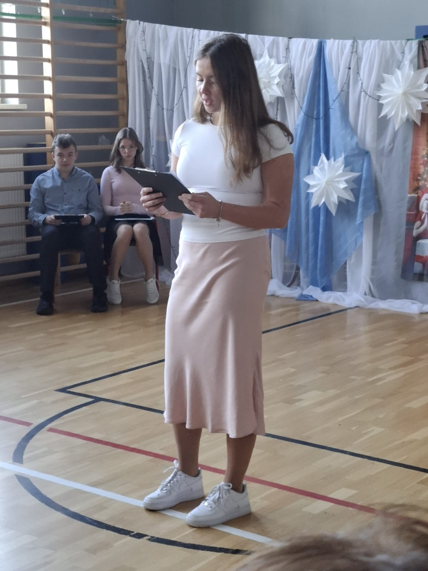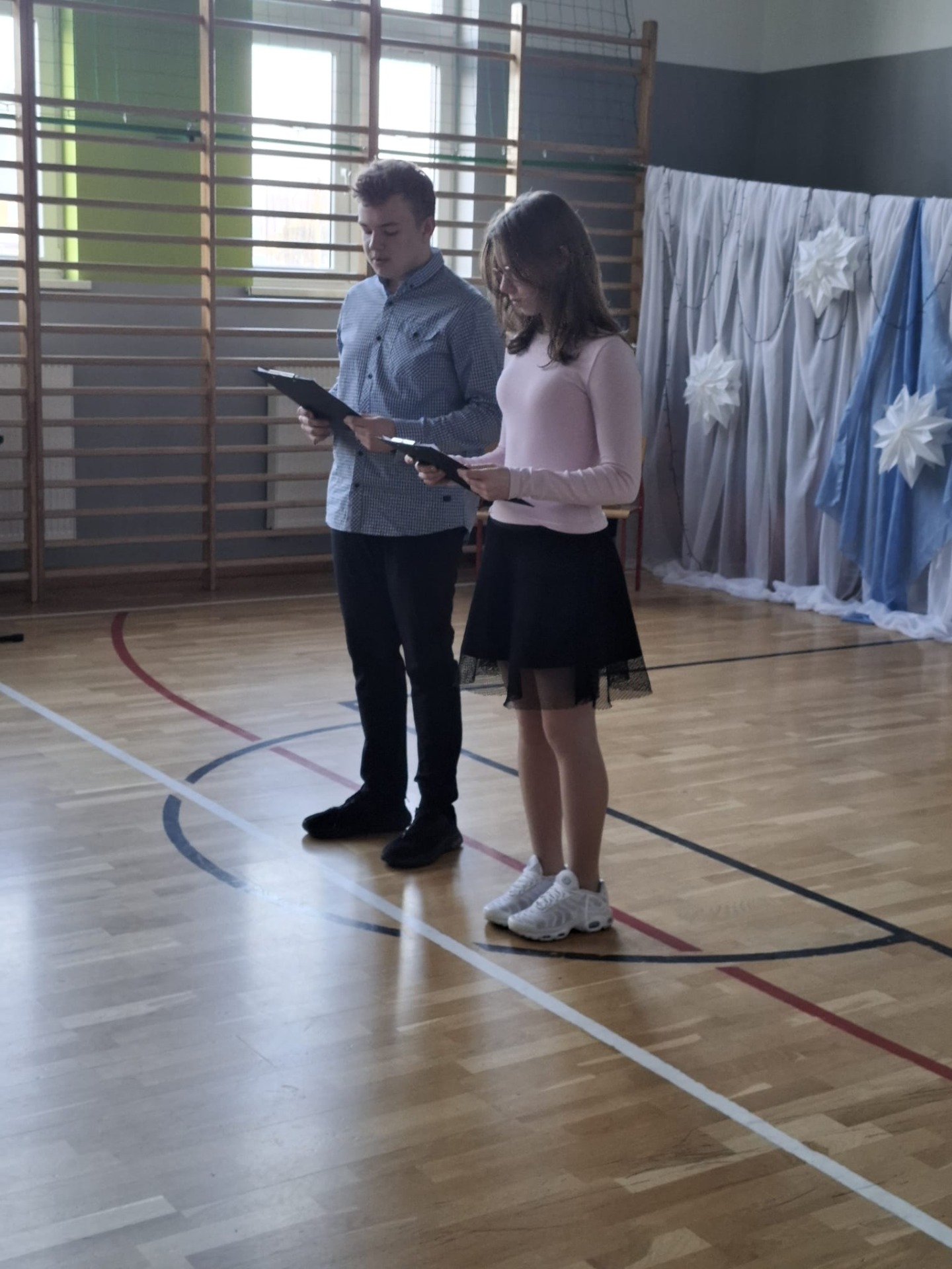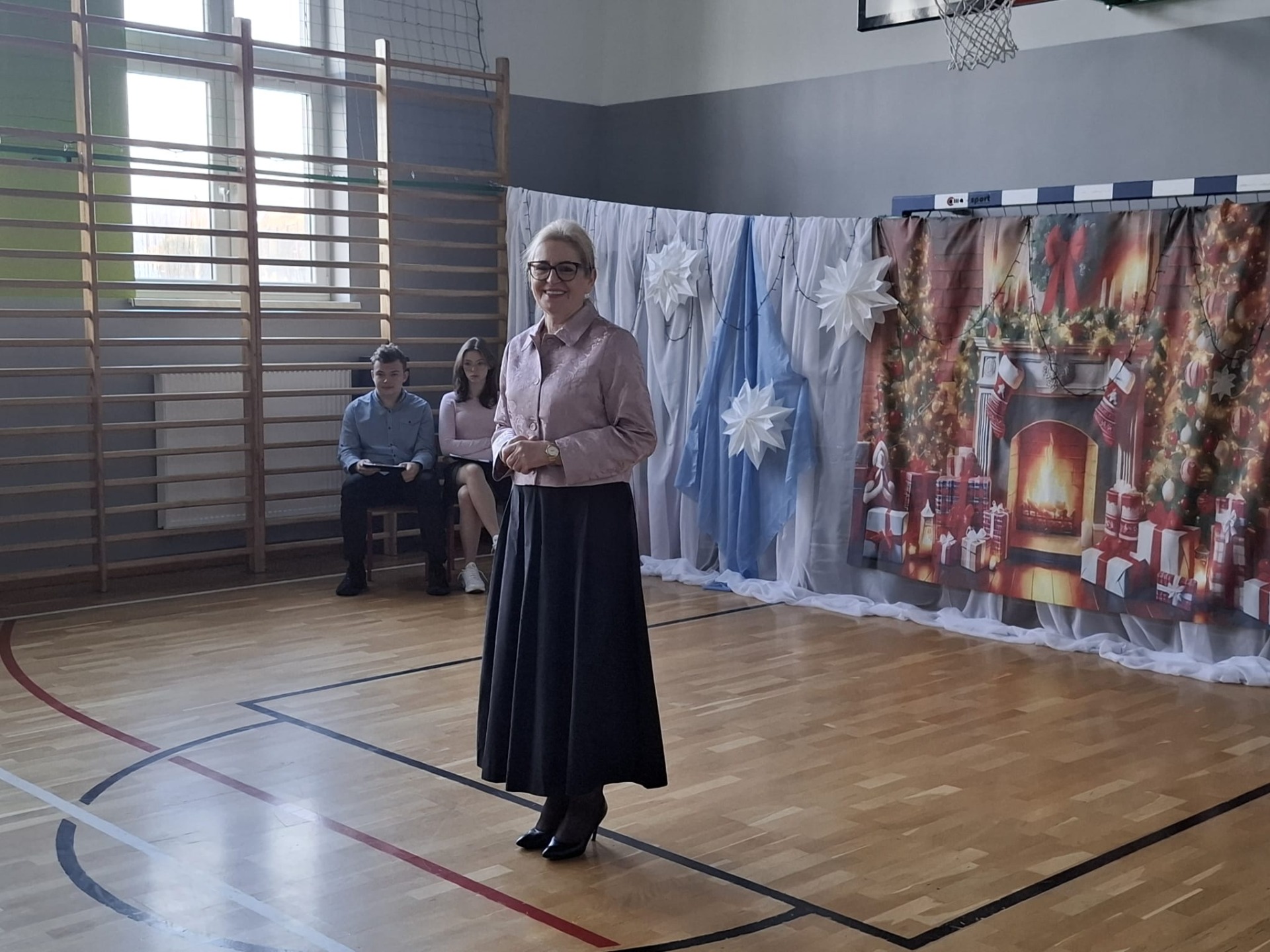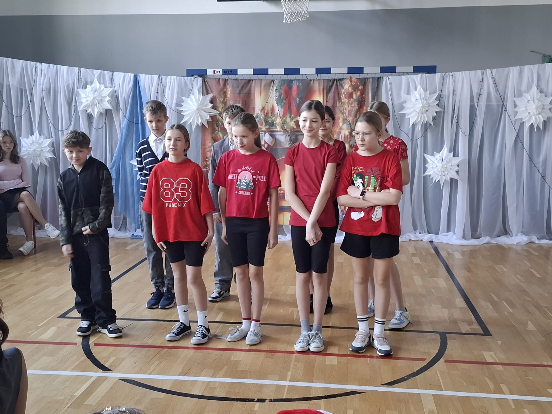 Dziś w naszej szkole zrobiło się naprawdę świątecznie! O godzinie 8:30 wszystkie klasy zebrały się na sali gimnastycznej, gdzie rozpoczęliśmy wspólne kolędowanie. Od samego początku panowała super atmosfera – było radośnie, ciepło i bardzo świątecznie.