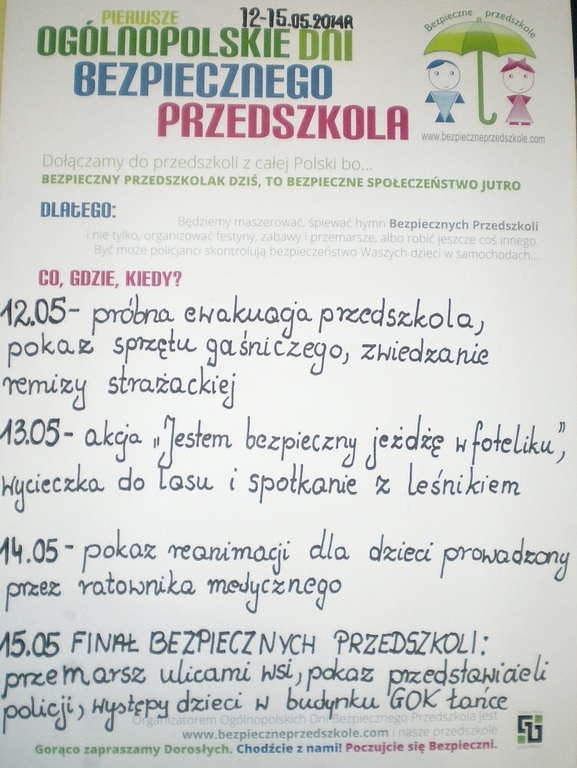 W dniach 12-15.05.2014 w przedszkolu w Łańcach odbędą się Dni Bezpiecznych Przedszkoli, które zostaną zorganizowane w ramach programu „Bezpieczne Przedszkole” realizowanego przez naszą placówkę. Celem Dni Bezpiecznego Przedszkola jest wspólne, ogólnopolskie ale równocześnie lokalne zaprezentowanie wartości, które przyświecają przedszkolom uczestniczącym w programie Bezpieczne Przedszkole. Uświadomienie w środowisku, że organiczna, codzienna praca z najmłodszymi przynosi ogromne korzyści: dziecko wyniesie z przedszkola nawyki bezpiecznego zachowania, zdrowego stylu życia i samodzielności. Chcemy by lokalni mieszkańcy zobaczyli, że bezpieczne społeczeństwo powstaje właśnie w przedszkolach. Zatem w przyszłym tygodniu dzieci czeka wiele atrakcji: odwiedzimy OSP Łańce, wykonamy próbę ewakuacji przedszkola, policja będzie kontrolować prawidłowe przywożenie dzieci do przedszkola, odwiedzi nas leśnik i ratownik medyczny. Zakończymy FINAŁEM BEZPIECZNYCH PRZEDSZKOLI, który odbędzie się w czwartek, na przemarsz dzieci ulicami wsi zapraszamy wszystkich mieszkańców. Informacje na temat przebiegu akcji będą umieszczane na stronie internetowej Gminy Kornowac i Zespołu Szkolno-Przedszkolnego w Kobyli oraz www.naszraciborz.pl